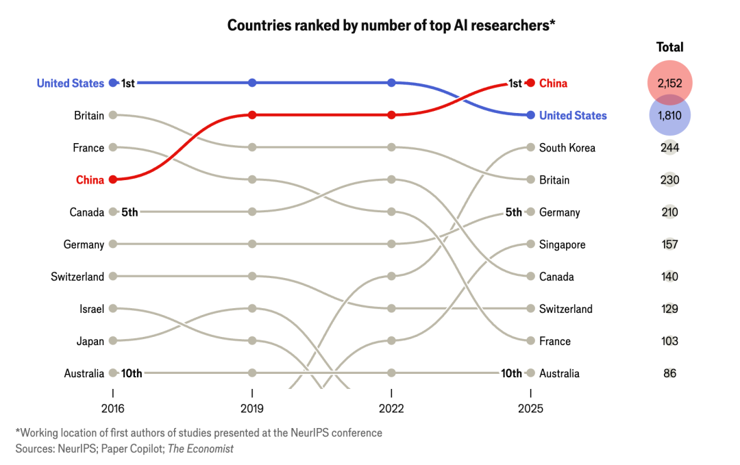 经济学人追踪了2025年12月举行的神经信息处理系统大会(NeurIPS)上发表论文的研究人员的教育背景,50%的AI研究人员在职业生涯初期来自中国(2019年仅为29%);与此同时,在美国起步的研究人员占比,则从20%下降到12%。它说明,全球AI顶尖研究人才的来源结构,正在重新洗牌。