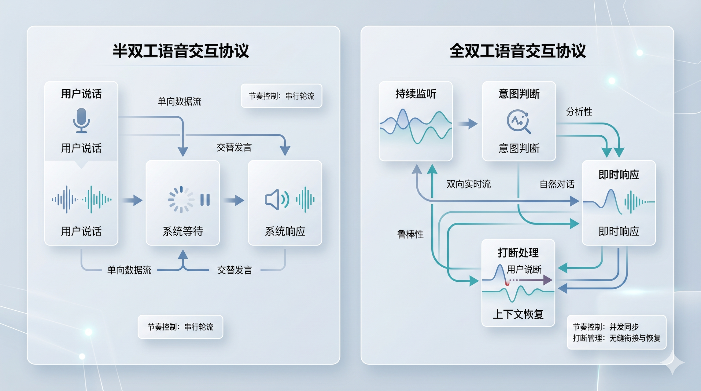 用户在真实语音场景里,经常会有这些状态:想一想再说、说一半改口、边说边组织、突然停顿两秒、被别人打断后再接回来。半双工系统很容易把这些停顿理解成“你说完了”,然后抢答。