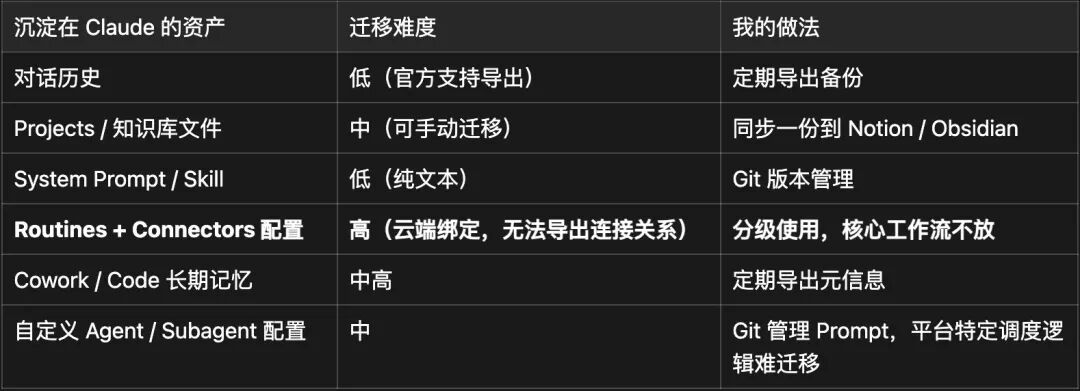 我把自己沉淀在 Claude 里的所有”资产”拆成了几类,按迁移难度打了分: