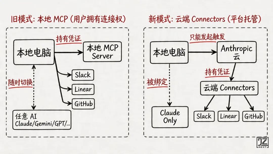 • 本地 MCP Server:凭证、配置、连接逻辑全部放在本地。这意味着使用者拥有绝对的所有权:理论上这些连接可以被任何支持 MCP 的 AI 使用,不止 Claude