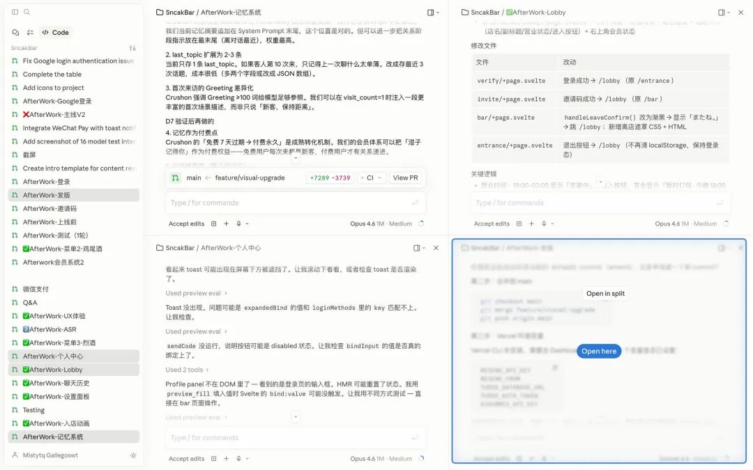 多对话并排:一个窗口里同时跑多个 Claude Code 会话,左侧边栏管理,拖拽式布局