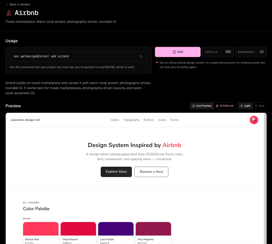 它的逻辑很简单,就是把页面该怎么配色、用什么字体、组件长什么样、版式怎么排,全部整理进一份 Markdown 文档里。