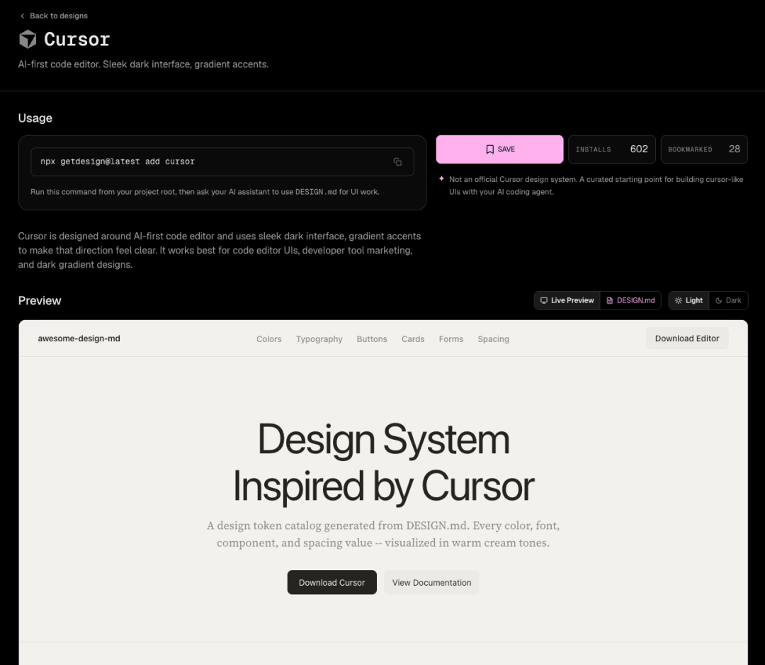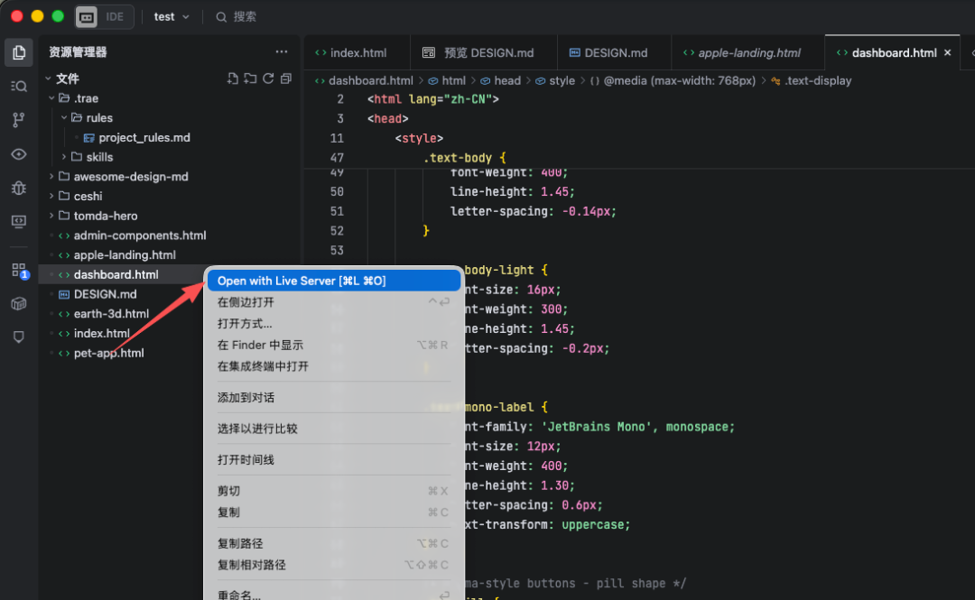 Claude Code、Cursor、Codex、Trae 这类 AI 编程工具都能直接读取 DESIGN.md。你只要把文件放进项目根目录,再告诉 AI 按这份设计规范生成页面,它就能照着这套风格往下写。