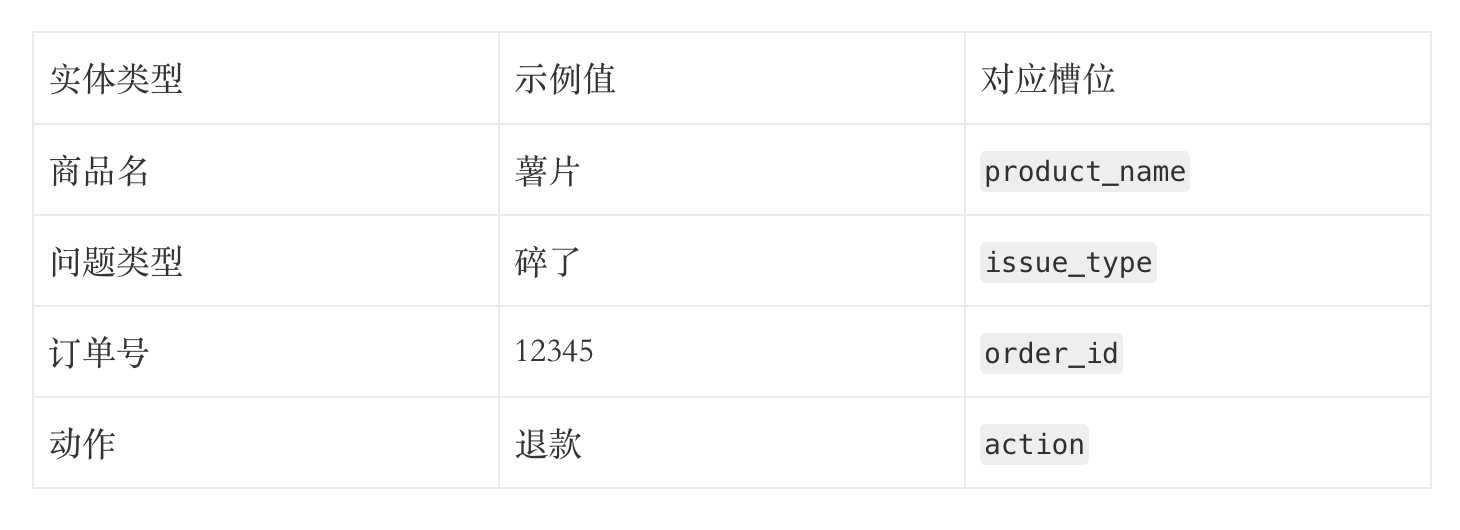 - 意图 apply_refund 需要的槽位:order_id, product_name, issue_type