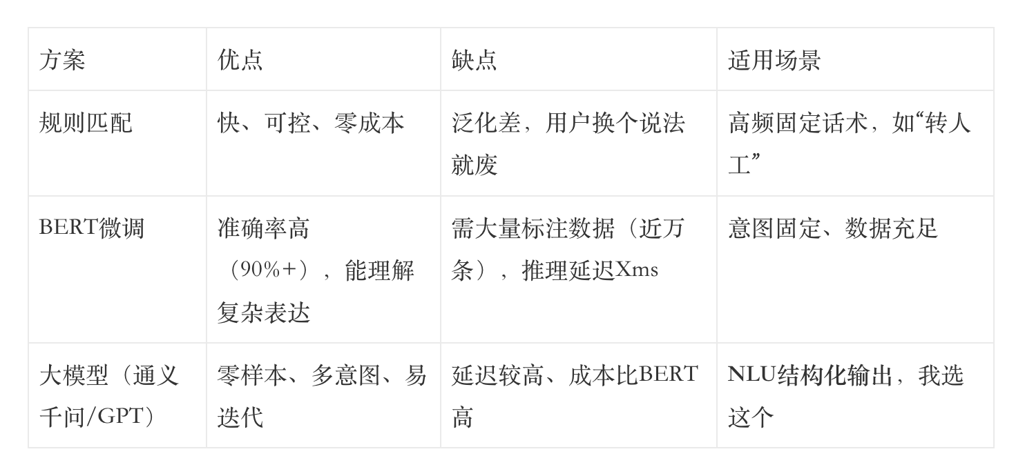 3. 技术现状:三种主流方案,我为什么选了“大模型做NLU”
