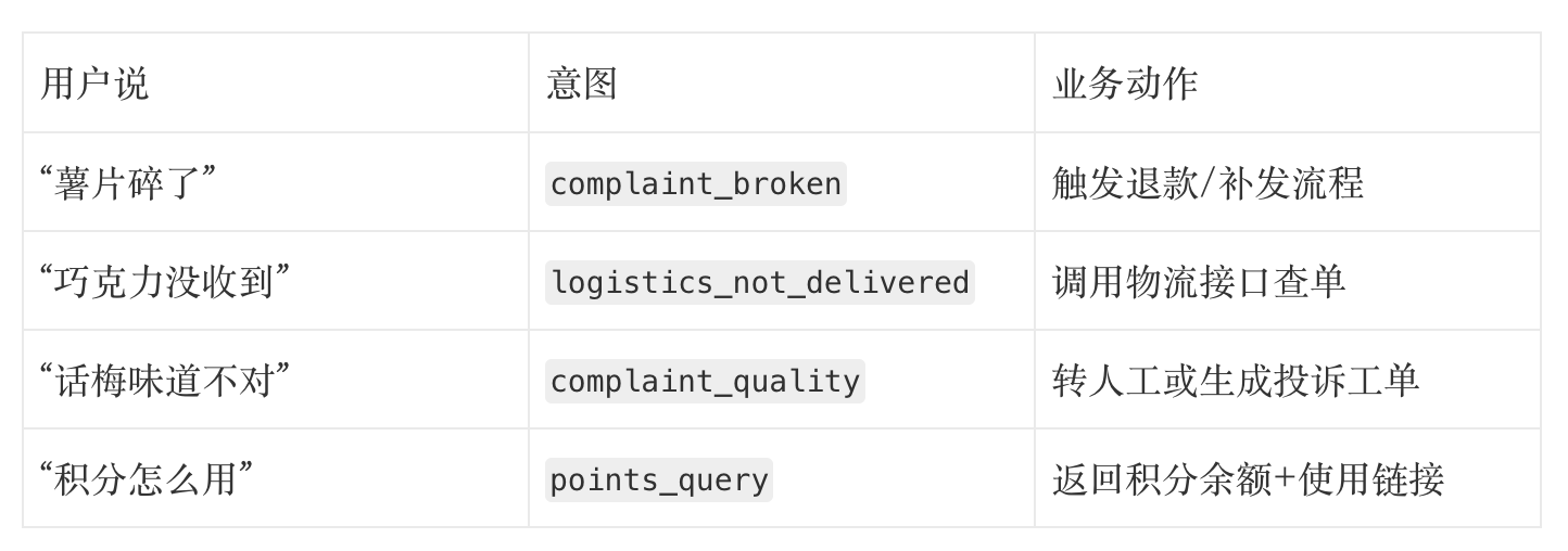 我们的意图识别模型输出:intent: “buy_product”(购买商品),因为模型把“薯片”当成了购买意向,“碎了”被忽略了。