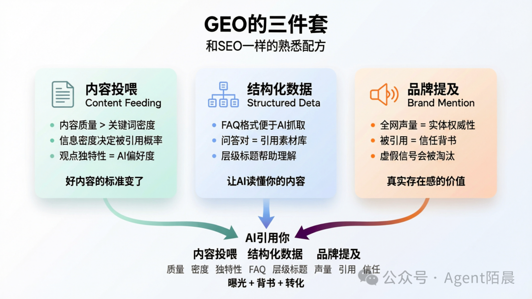 SEO时代,我们生产内容是为了被搜索引擎收录。GEO时代,生产内容是为了被AI引用。