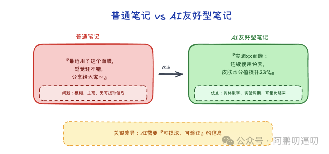 改造后:「实测XX面膜:连续使用14天,皮肤水分值提升23%。以下是具体测试方法和对比数据。」