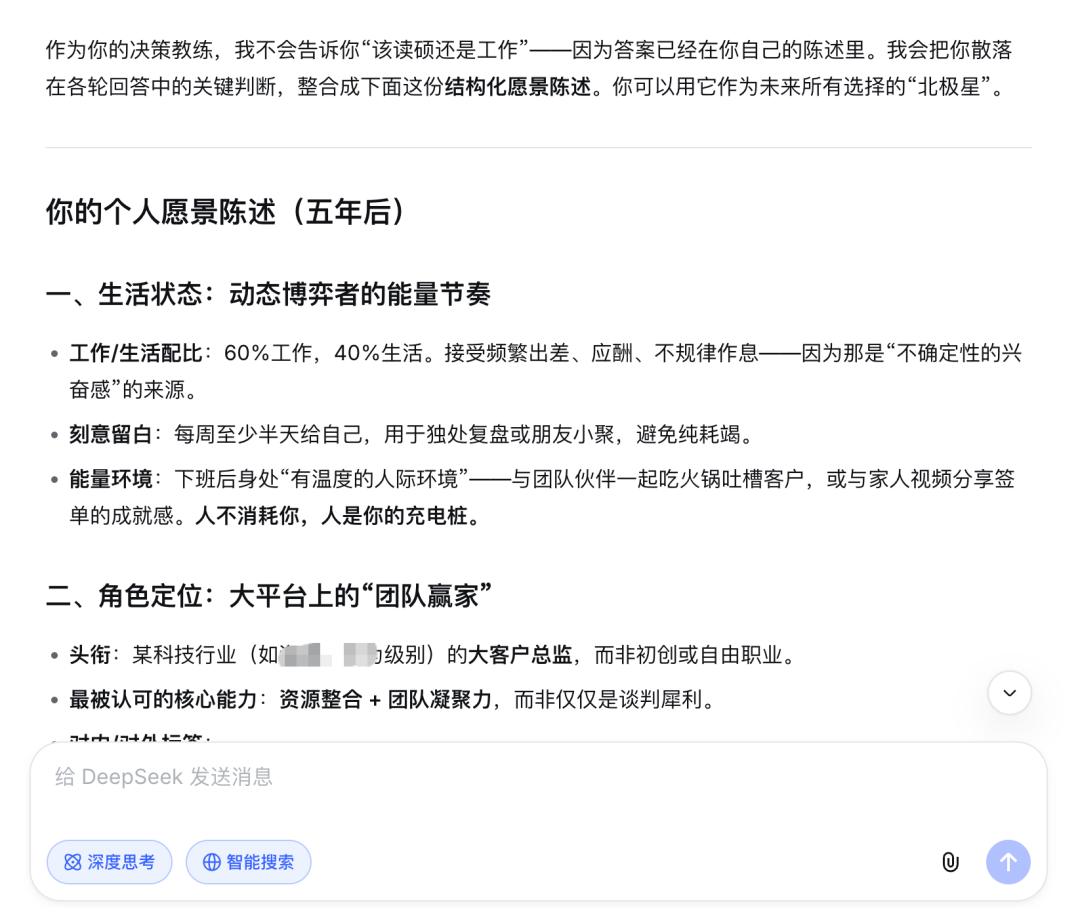 (4)最终输出结构化的愿景陈述,涵盖生活状态、角色定位与核心价值三个维度。