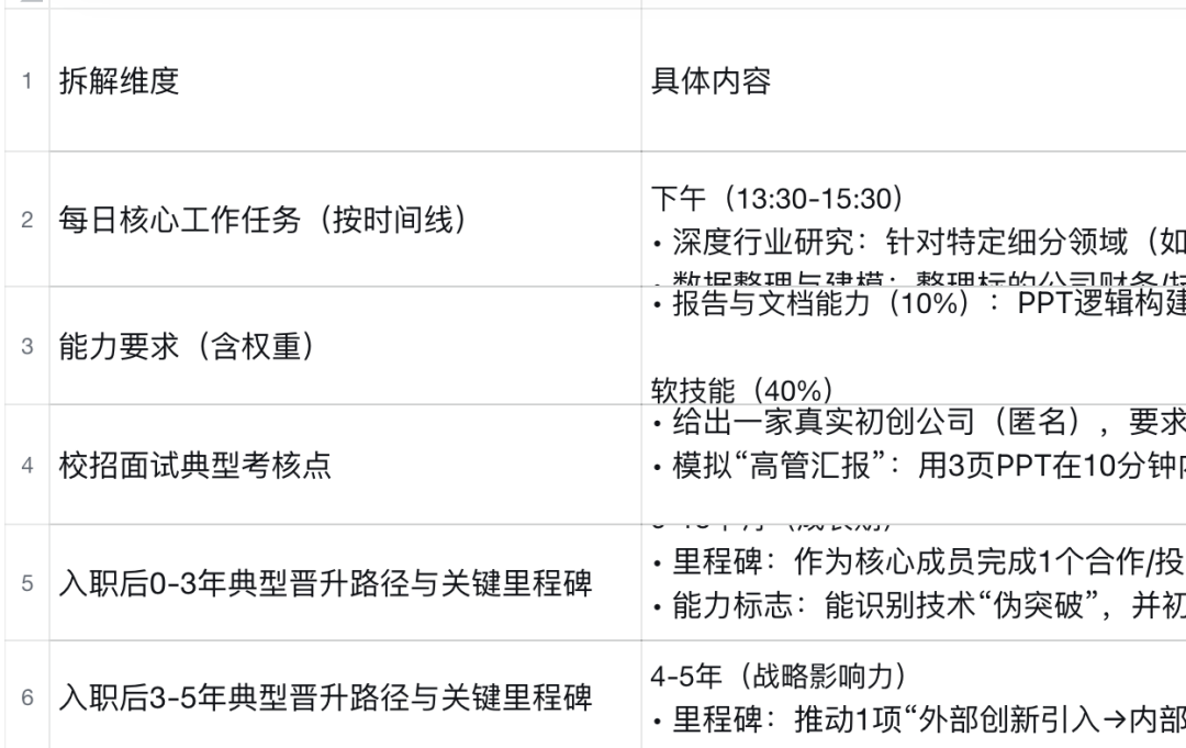 在本案例中,通过引入人工智能工具,对目标岗位进行了结构化拆解,主要包括四个方面:日常工作任务、能力结构、发展路径以及隐性门槛。