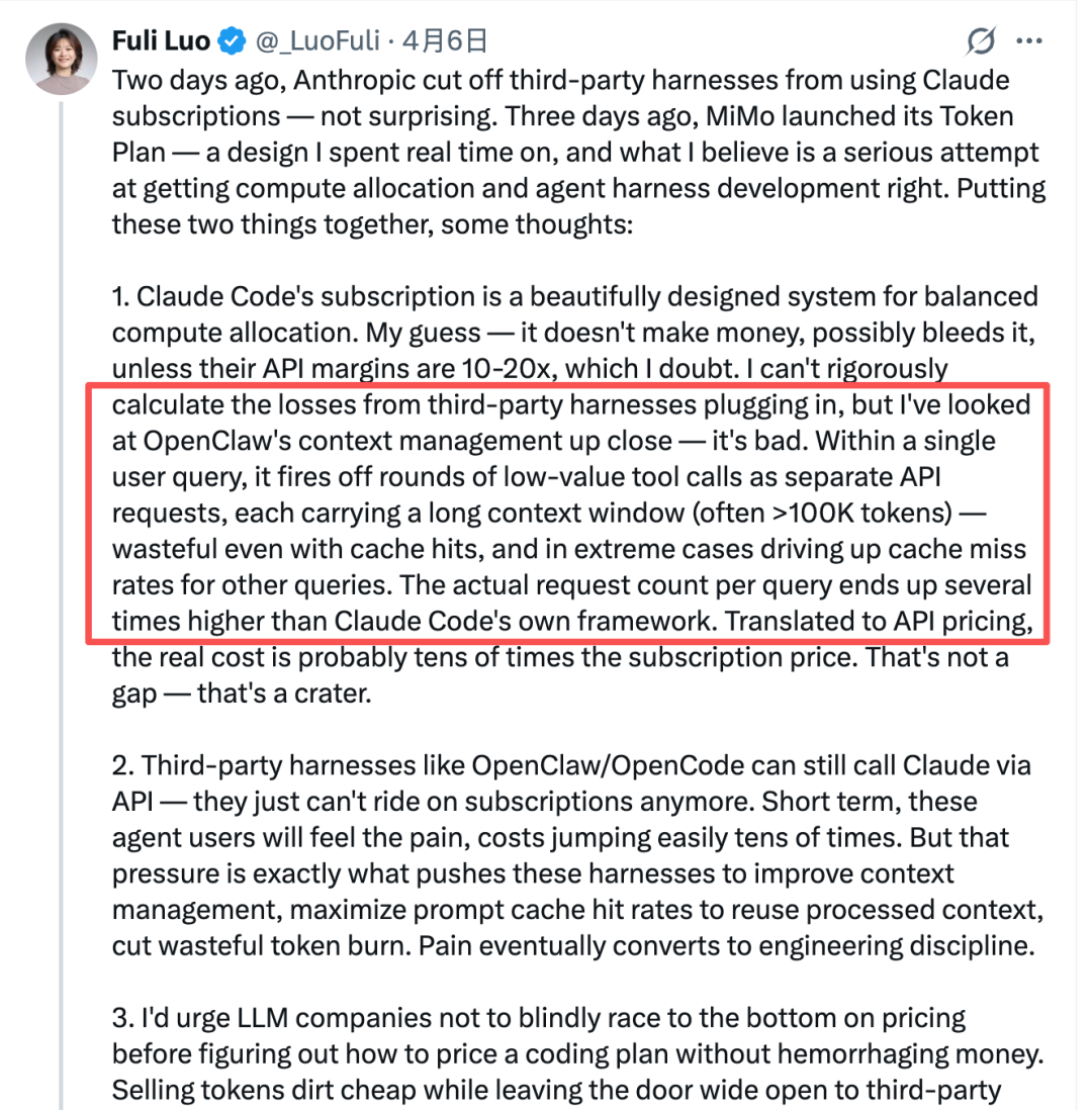 小米AI模型负责人罗福莉在Twitter上发过一篇很有分量的长推文(https://x.com/_LuoFuli/status/2040825059342721520)。