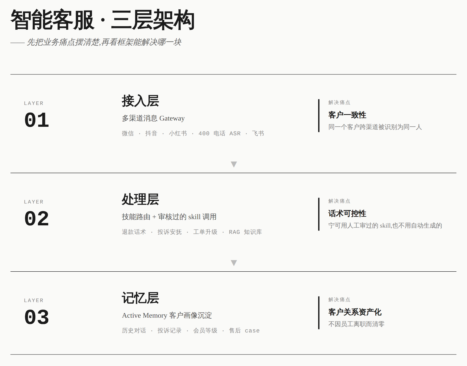 第二步,把业务痛点摆清楚,再映射能力。不从OpenClaw有什么讲起,从客服业务面对的三件事讲起:客户分散、话术可控、关系沉淀。把业务先立住了,再讲OpenClaw如何一层一层解决。