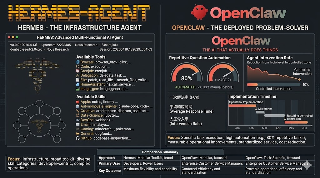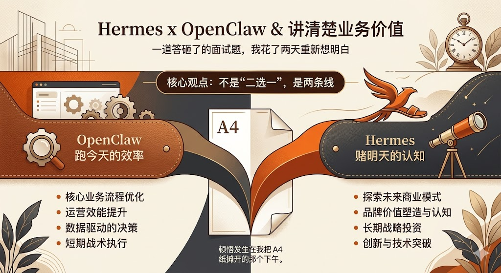 这个“两条线”的观察,是我坐在那里画了一整个下午才想明白的。不是因为它有多难,而是因为一开始我被“二选一”的逻辑框死了。面试题是“OpenClaw和Hermes的区别”,我顺着就去比较,根本没意识到业务场景里它们可以同时存在。