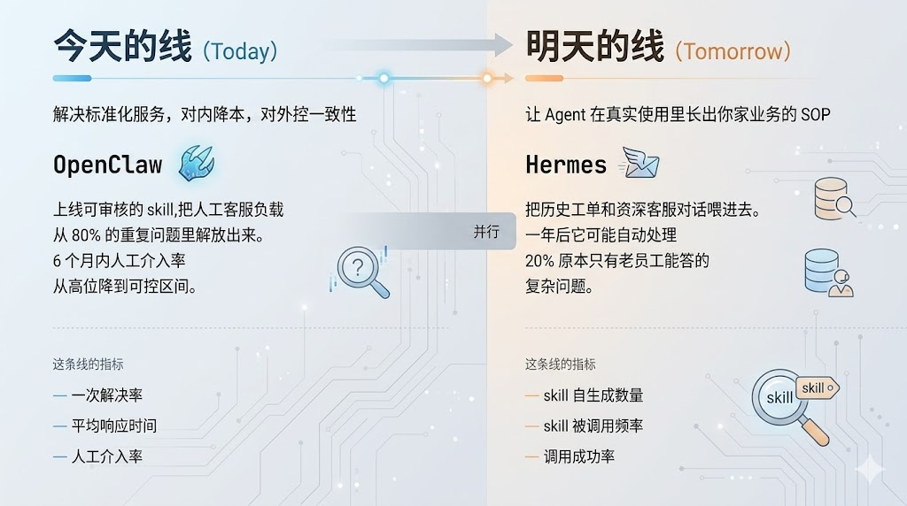 只用OpenClaw,你得到的是“和同行一样能用的客服系统”。只用Hermes,你得到的是“可能两年后非常懂你业务、但今天还不敢上线”的东西。两个一起上,才有可能做出竞争对手短期内抄不走的客户服务壁垒。