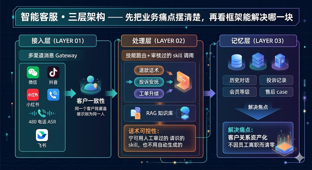 面试时我答的那句“多渠道接入、智能路由、跨会话记忆”到听起来很全,但每一句都是悬空的。多渠道接入,接入的是什么?智能路由,路由到哪里?跨会话记忆,记忆给谁用?