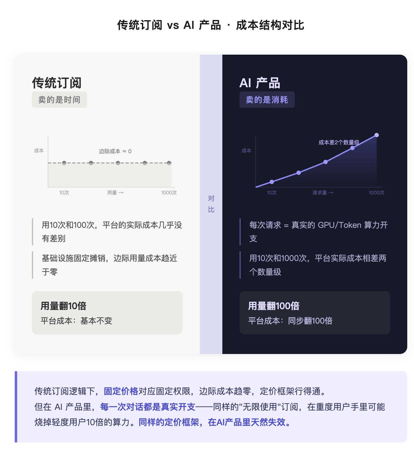 用户每发一次请求,背后是真实的 token 消耗、真实的算力开支。用 10 次和用 1000 次,对平台来说成本差了两个数量级。如果你还按「时间段」收费,结果只有一个: