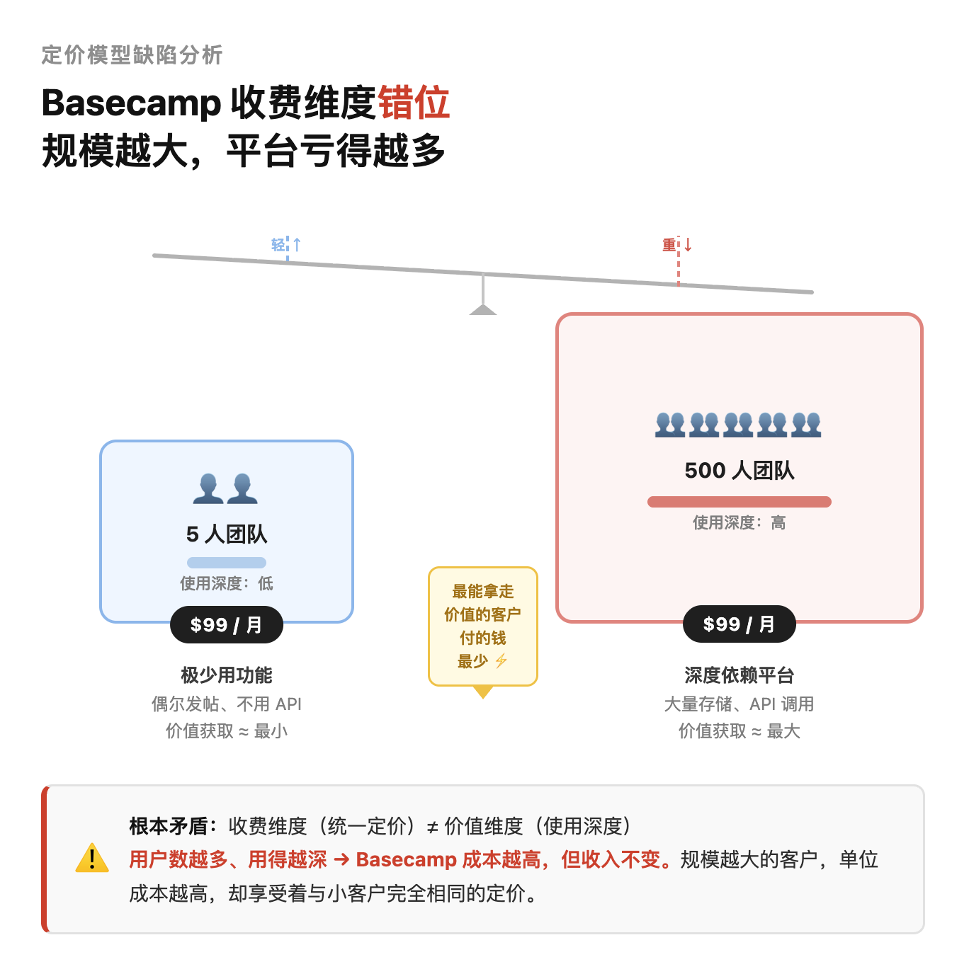出发点很好:简单、透明、对用户友好。但 5 人团队和 500 人团队付一样的钱——最能从产品里拿到价值的客户,付的钱最少。