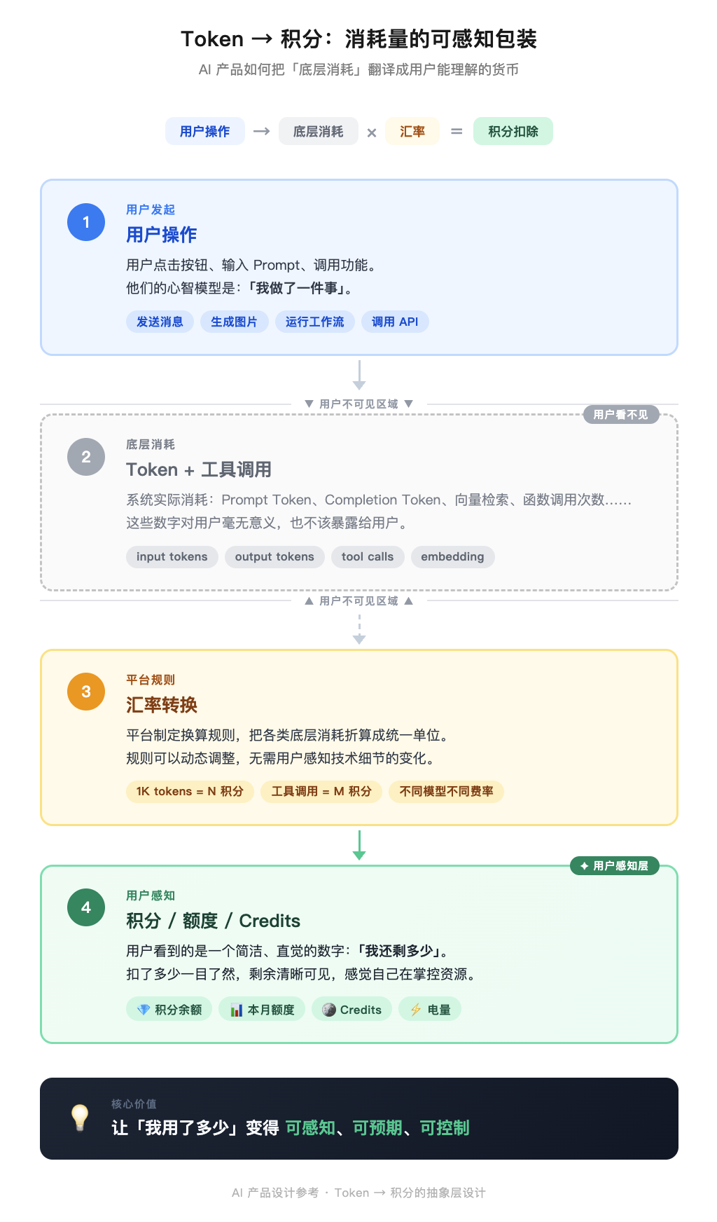 这一层不是噱头。它在解决一个真实的感知问题:让「我用了多少」变得可感知、可预期、可控制。用户愿意为看得见的东西付钱,不愿意为「不知道会烧多少」的黑箱买单。