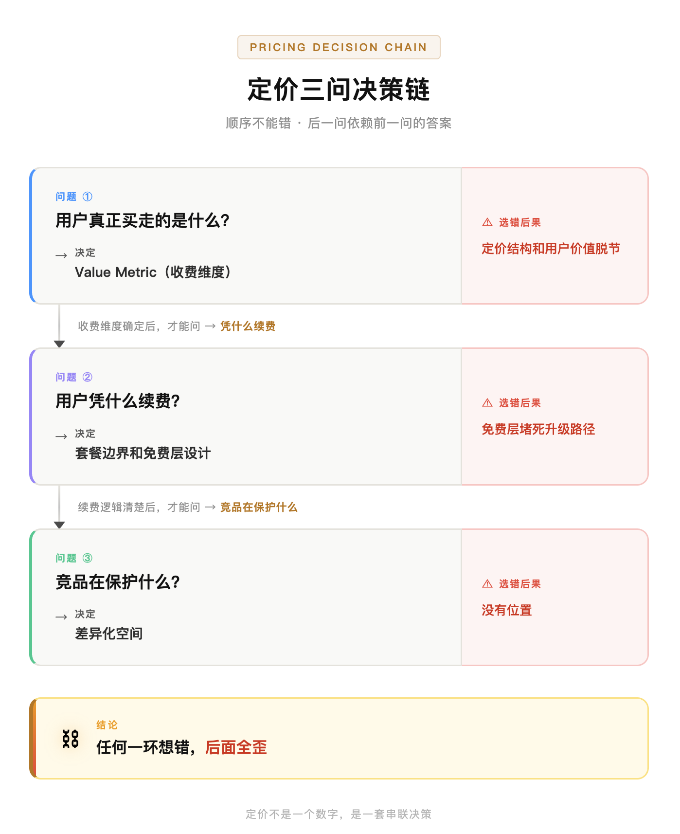 定价从来都是三个问题串联在一起的决策链。顺序不能错——第一个没想清楚,后面两个根本无法正确回答。