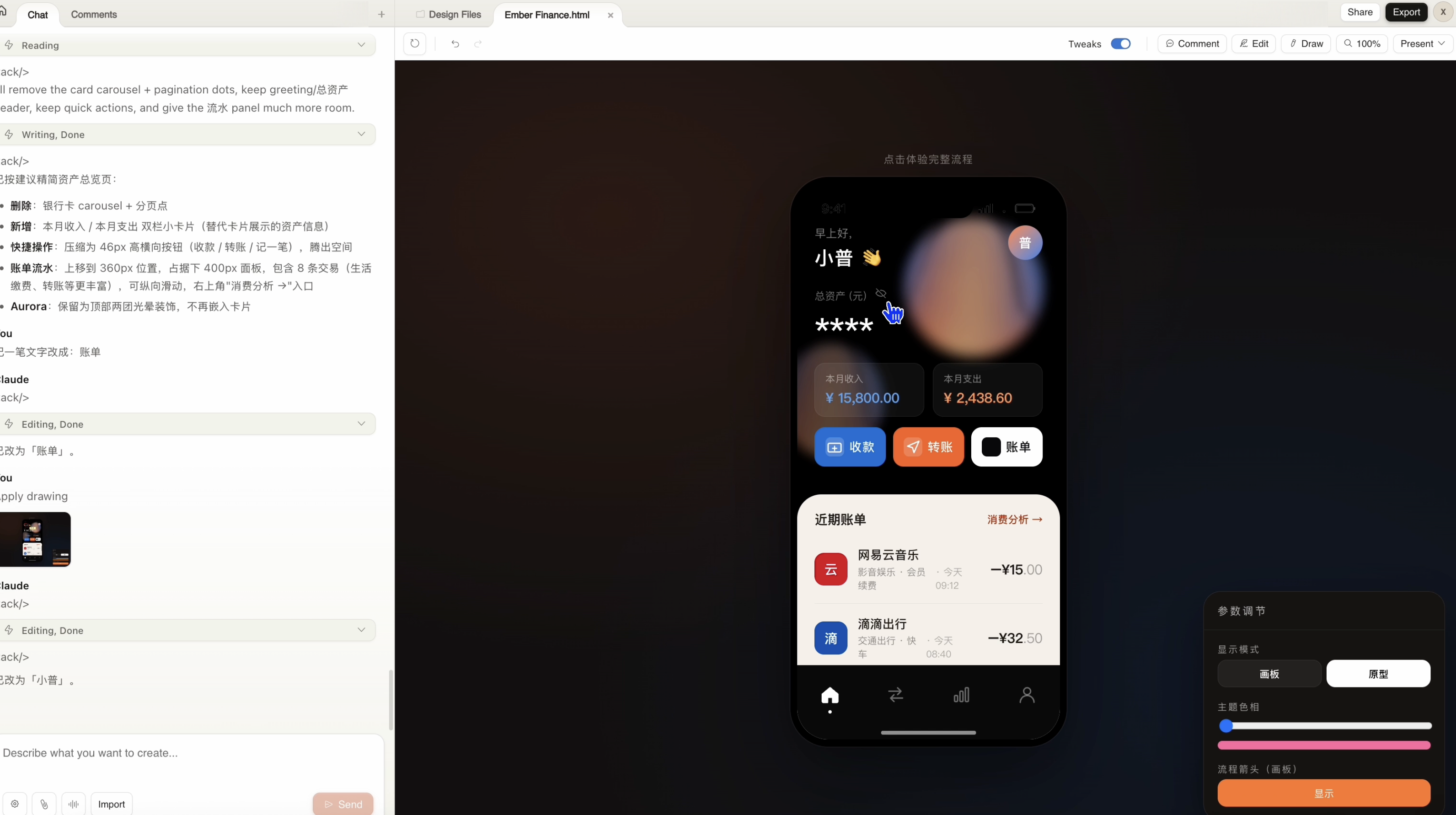 然后我又让它删掉资产总览页的银行卡轮播,把近期账单流水直接铺上来,快捷操作压缩成横向按钮组。整个页面的信息密度和实用感都上去了。