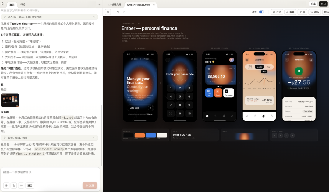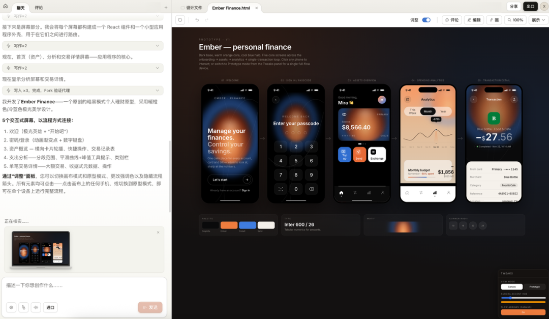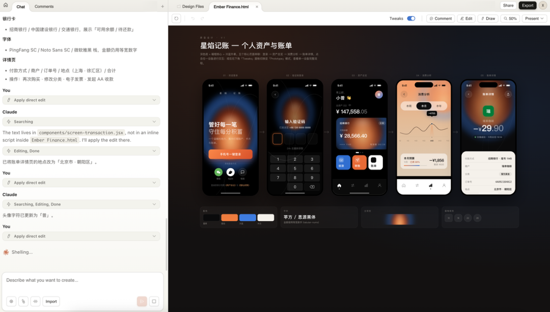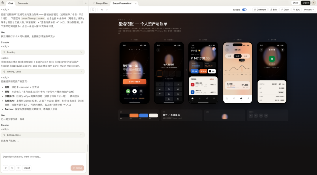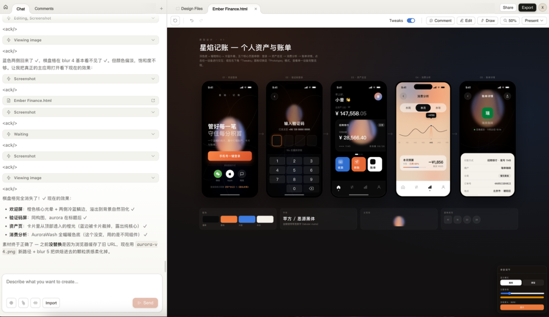 Claude 收到之后,先把设计系统自己定了一遍:底色、点缀色、字体、图案、屏幕数量,然后开始一屏一屏地画。