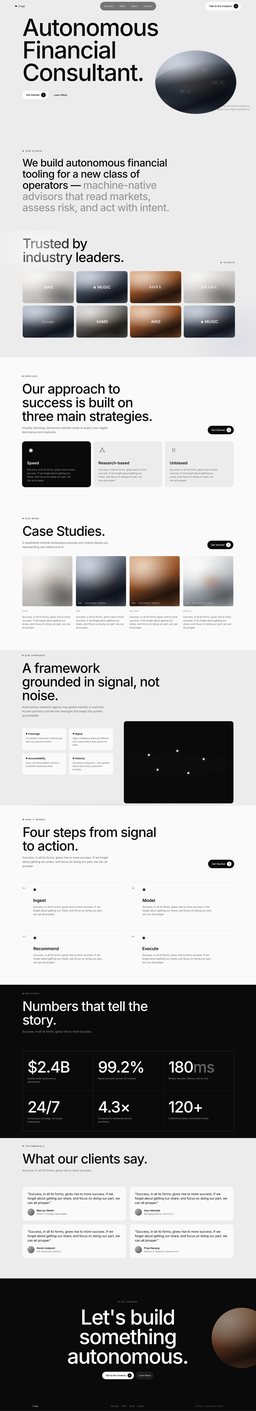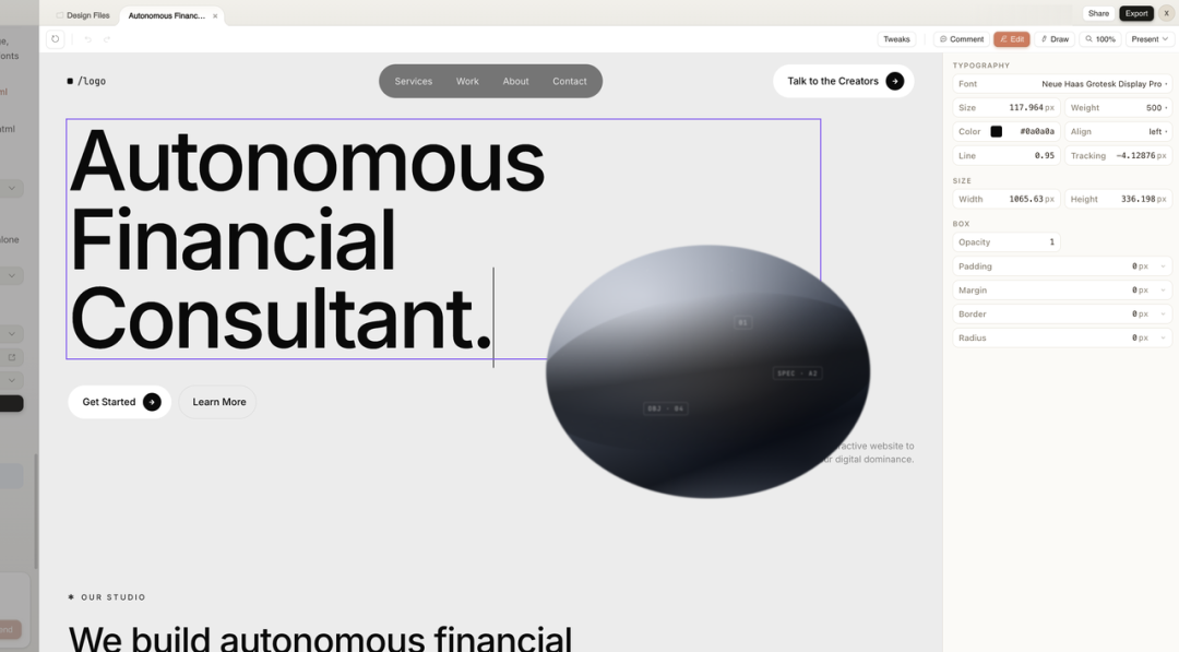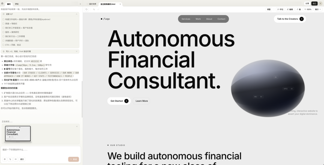 一个完整的落地页就这么生成了。黑白单色、大字报排版,导航栏、Hero 区、服务介绍、CTA 按钮,该有的全有。而且它选的字体、字重、字间距这些参数都不是随便糊的,确实在还原那种高端 agency 网站的质感。