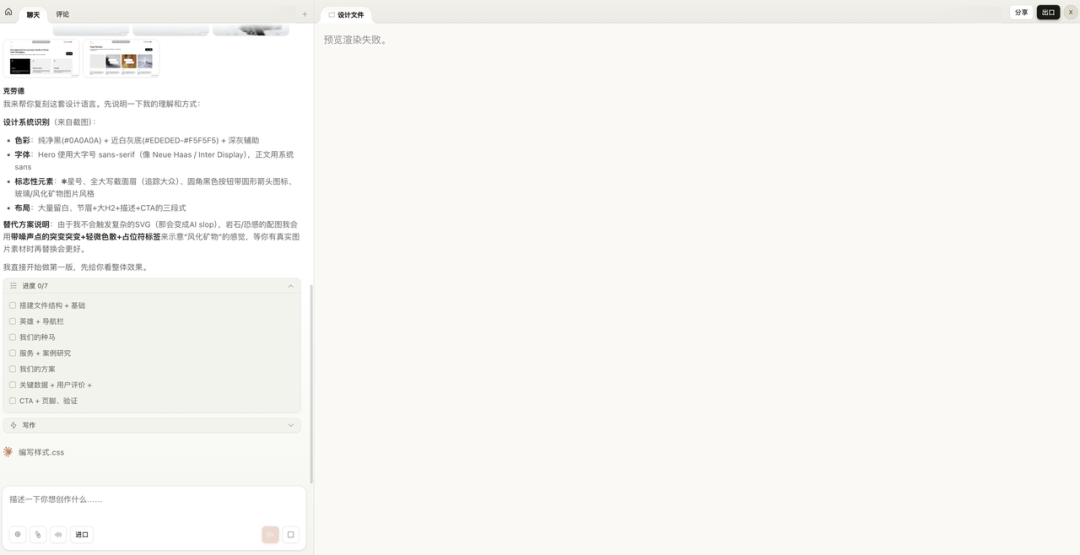 Claude 收到截图之后,第一件事不是直接开画。它先把自己理解的设计语言列了出来:配色方案、字体选择、标志性元素、布局逻辑,全部自己总结了一遍。然后拆了一个 7 步的进度条,从文件结构到页面组件,一步一步往下推。