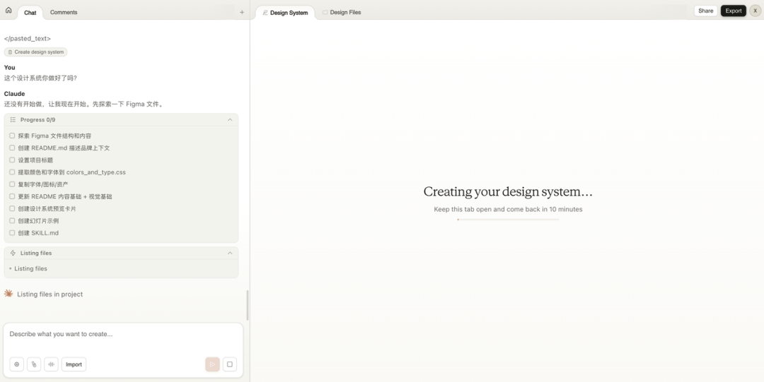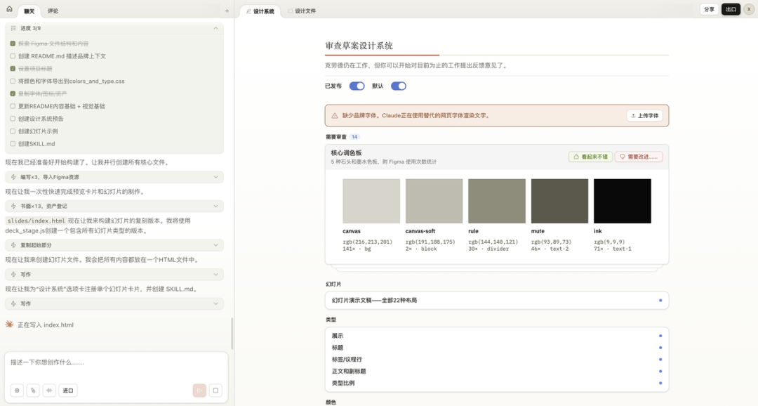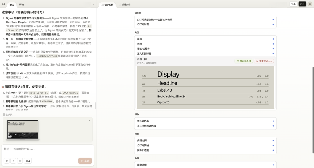 接下来就是等了。Claude 花了大概 10 分钟,把整个 Figma 文件解析了一遍。它拆出来的东西非常细:核心调色板、字体比例、间距规则、幻灯片布局类型、图像处理方式,全部结构化地呈现在设计系统面板里。