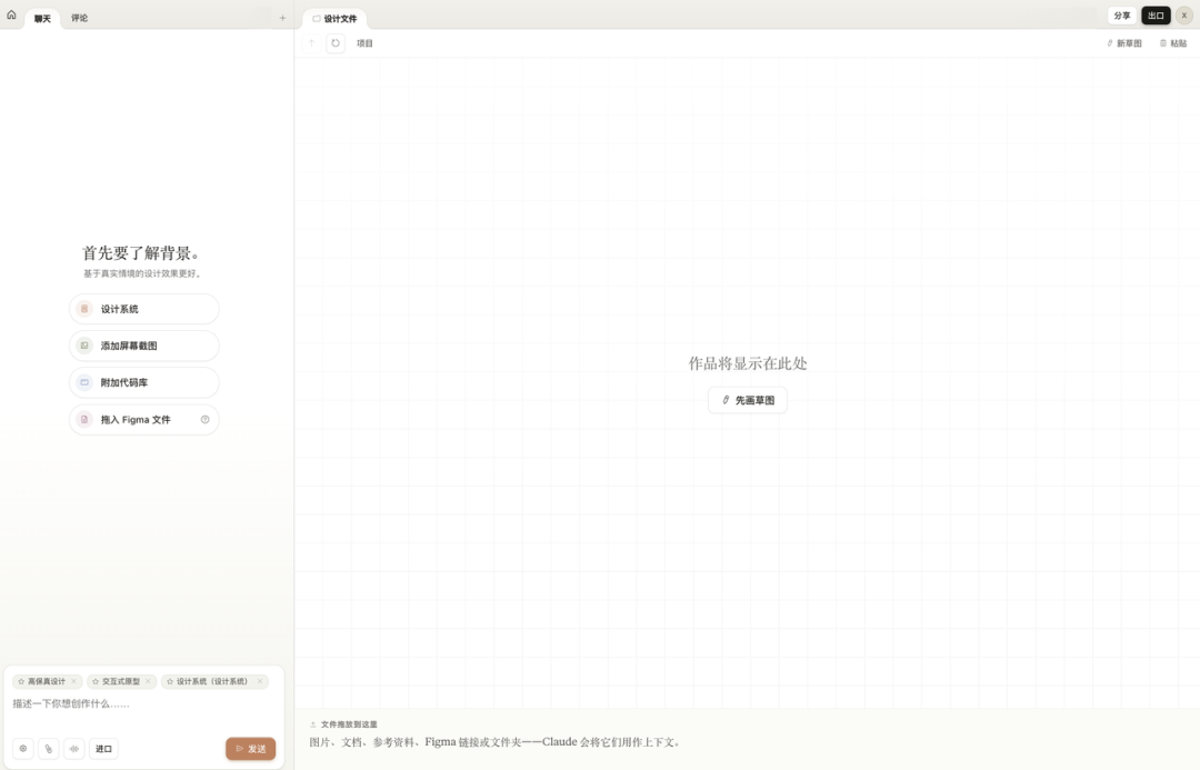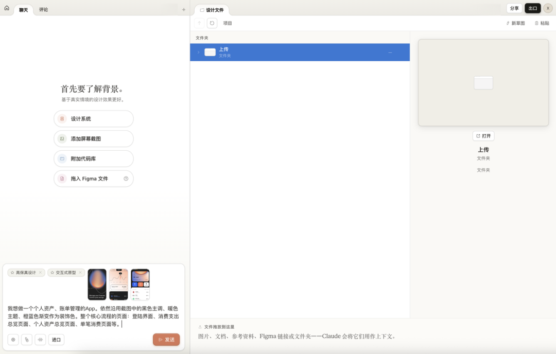 创建项目的时候可以选 Wireframe 或 High fidelity 两种模式,进去之后左边是 Chat 对话区,右边是 Canvas 画布。你还可以给项目添加上下文,比如截图、代码库、Figma 文件,Claude 会基于这些素材来理解你要什么。