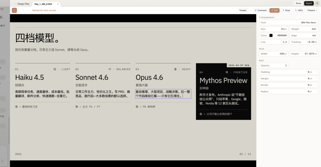 出来的效果确实牛逼。我原来的课件内容完整保留,但整个视觉风格都变了:字体、配色、纹理背景,每一页都严格遵循设计系统的规范。而且直接就能编辑、改文字、调间距。