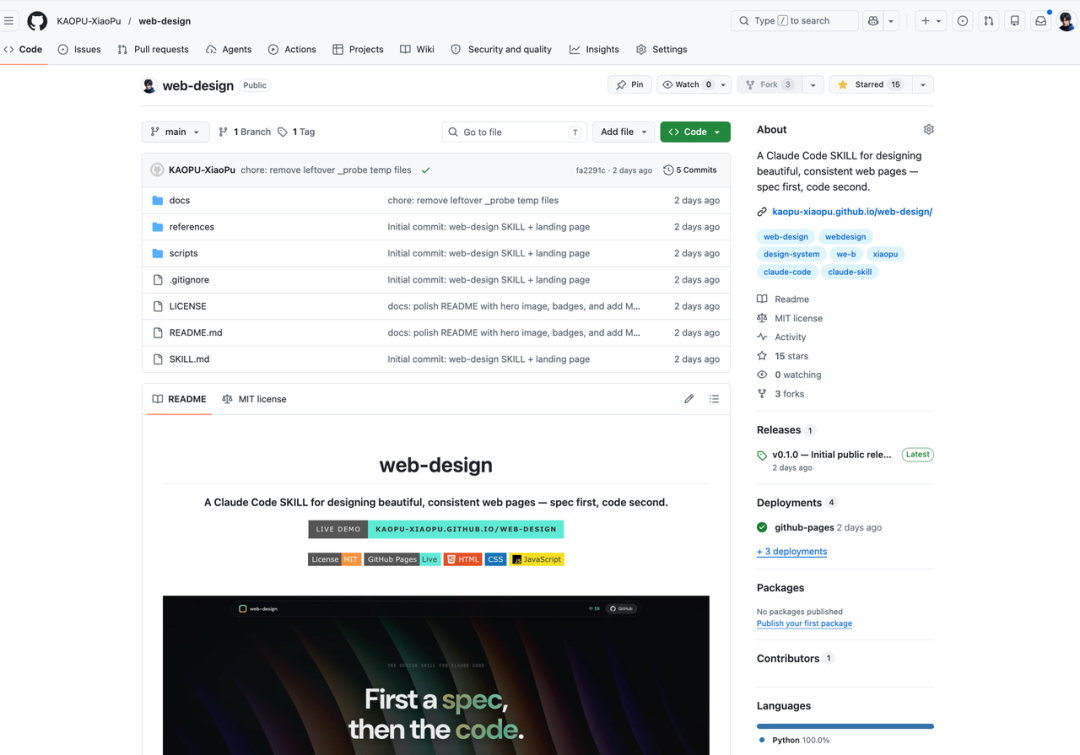 我自己也搓过一套web-design Skill,干的就是这个事:先确定设计规范,再写代码。设计规范里包含 5 套预设的设计 Token,每套有完整的配色、字体、间距、圆角规则。这个Skill我直接开源到了Github上,庆幸赶在了Claude Design上线的前一天!