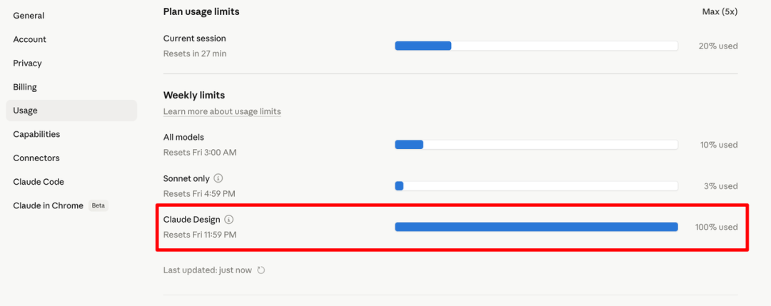 不过有一点要提前说:它特么真的很费 token。Claude Design 的用量是单独计算的,和普通对话、Claude Code 分开。我一天跑了三个案例,额度直接拉满到 100%。