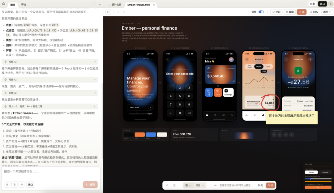 但初版有个 bug:消费分析页的月度预算金额超出了卡片边界。我直接在画布上画了个圈标注了一下。