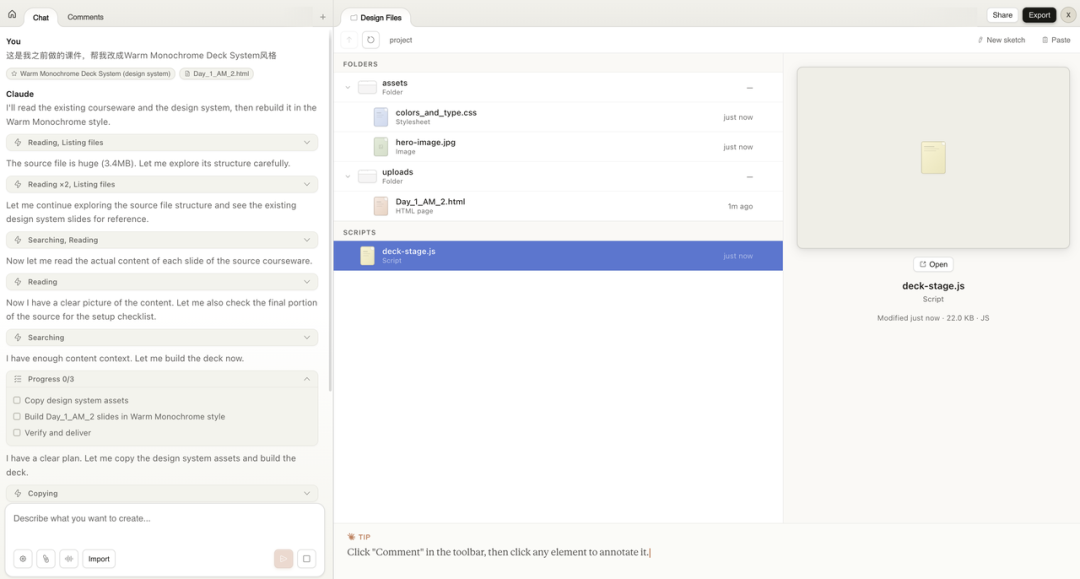 Claude 先读了课件内容和设计系统,然后拆了个 3 步的任务:拷贝设计系统资源、按新风格重建课件、验证交付。