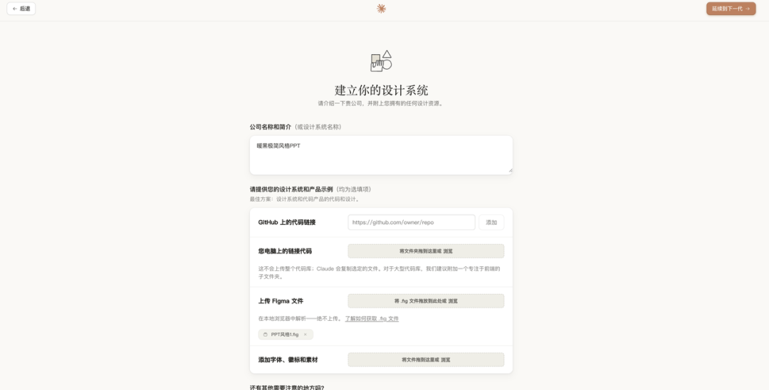拿到 .fig 文件之后,回到 Claude Design,在设计系统创建页面把文件上传进去。