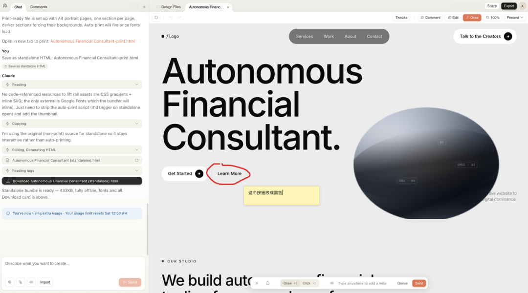 第二个更离谱:画圈标注。你觉得某个地方有问题,直接在画布上画个圈,写上备注,发给 Claude 让它改。底部还会显示你的操作记录。这就是设计师和开发之间 review 的体验,只不过对面坐的是 AI。
