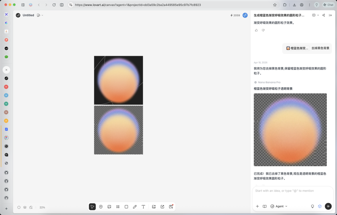所以我做了一件事:用Lovart单独生成了一张橙蓝渐变呼吸效果的光效素材,去掉黑色背景,然后丢回 Claude Design 里替换。
