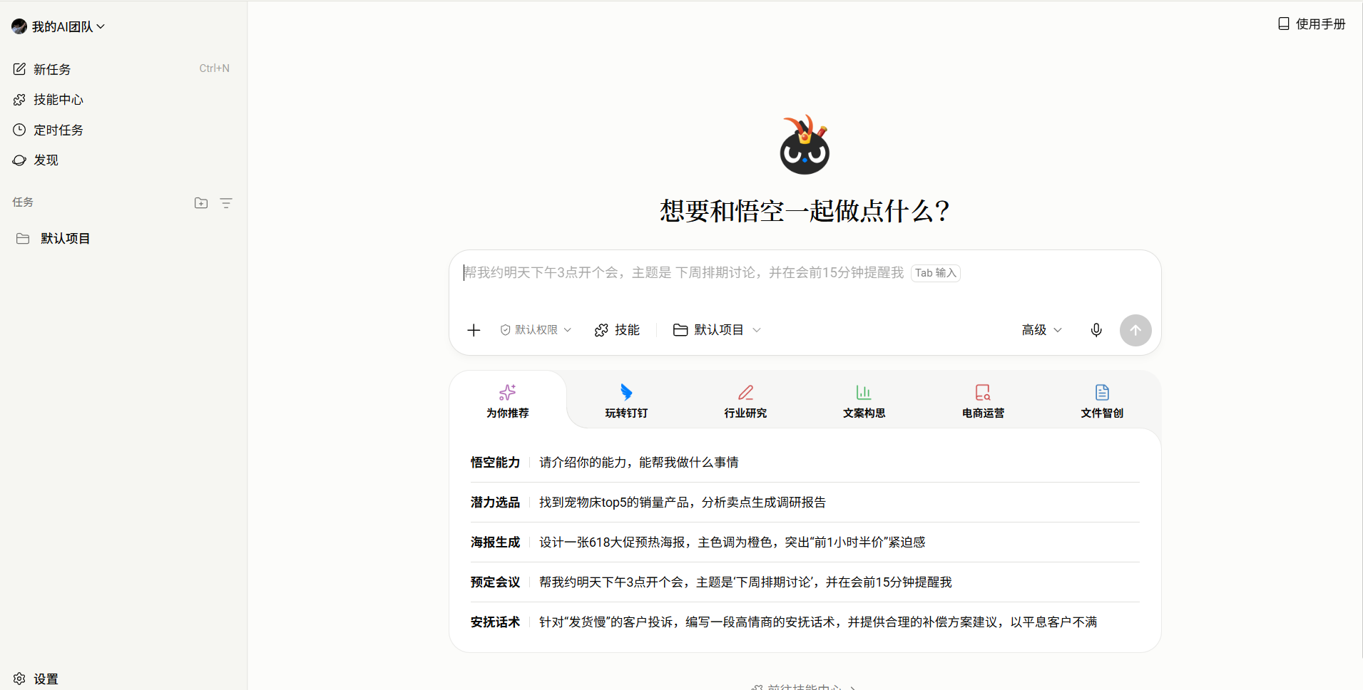 项目制管理:解决纯对话AI的核心痛点:左侧任务列表沉淀所有AI执行的任务,支持按项目管理,完美解决了纯对话式AI「任务无沉淀、无追溯」的问题,符合企业用户的工作流程管理需求——企业办公最看重「可追溯、可审计」,这一点精准命中痛点。
