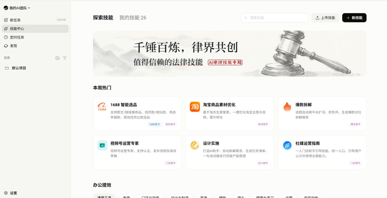 技能中心:核心是「可扩展」,支持搜索技能、职业/团队精选技能,同时允许用户上传技能、创建技能(内置技能)、技能重命名、技能管理。
