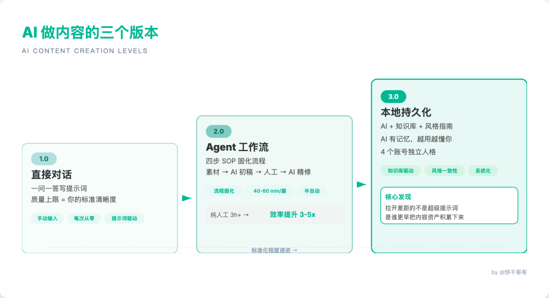 3.0 的核心发现:拉开差距的不是谁会写超级提示词,而是谁能更早把自己的内容资产积累下来。提示词只是调用层,底层是你的知识库质量。