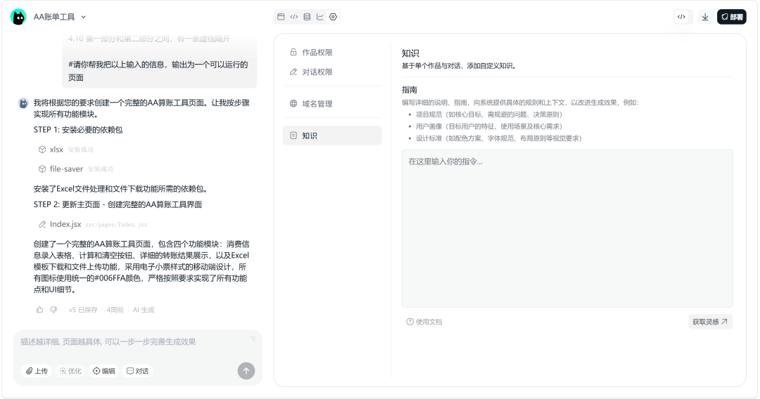完成所有步骤后,挑选一个你满意的版本,点击右上角的“部署”按钮,就能创建出一条让他人访问的链接。