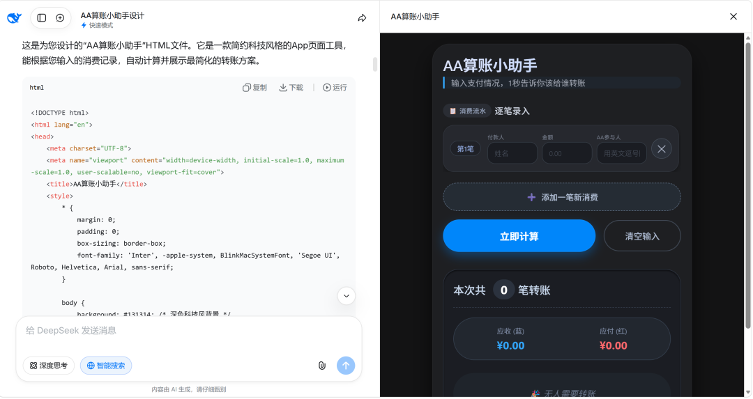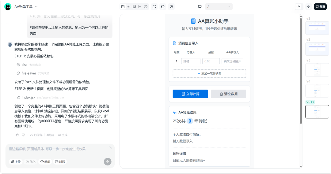 我这次用AI制作的是一款“AA算账工具”,灵感来源于跟朋友们出去玩,每次需要支付的金额、需要AA账单的人数,多有不同。为了减少多对多转账的麻烦,兼市面上暂无100%契合我使用需求的应用,遂尝试自割腿肉开发之。