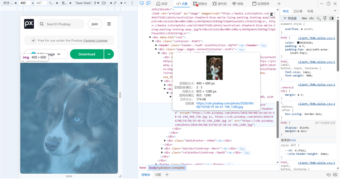 此外,如果发现点击右键获得的链接,AI还是难以识别,可按住F12进入“元素审查模式”,点击最左侧的“检查”按钮,将鼠标移动到图片所在位置,就能拿到一个方便AI识别的图片链接。