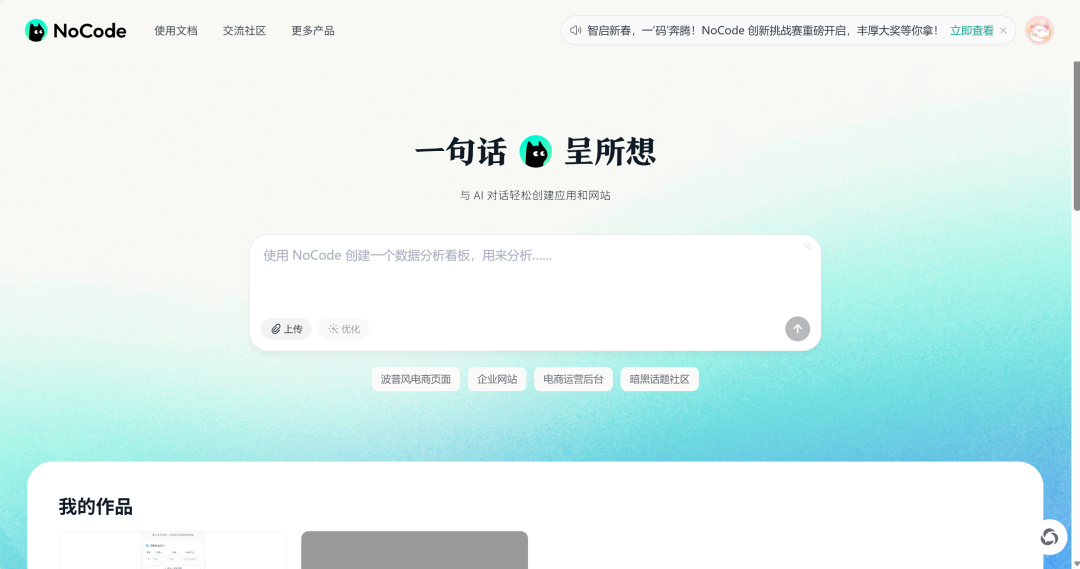 好啦言归正传,所以如果你也像我一样,没有编程基础,又超级想把灵感一瞬,落地成给生活添点色彩的趣味应用,这款美团公司出品的编程类AI Agent——NoCode,势必体验一下!事先声明,这绝不是广告贴,我跟美团,除了日常点外卖(以及被恒生科技etf刺痛)的关系,再无其他金钱往来……