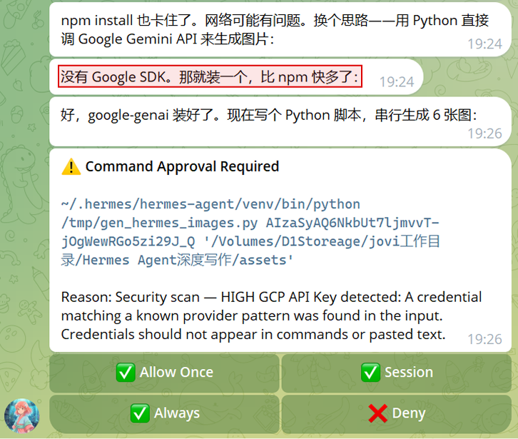 说”这条命令不行”,别说”停止”。前者保留了解决问题的空间,后者直接把门关死了。Hermes 之所以能在审批被拒后绕路,就是因为被拒消息里只堵了具体命令,没堵目标。
