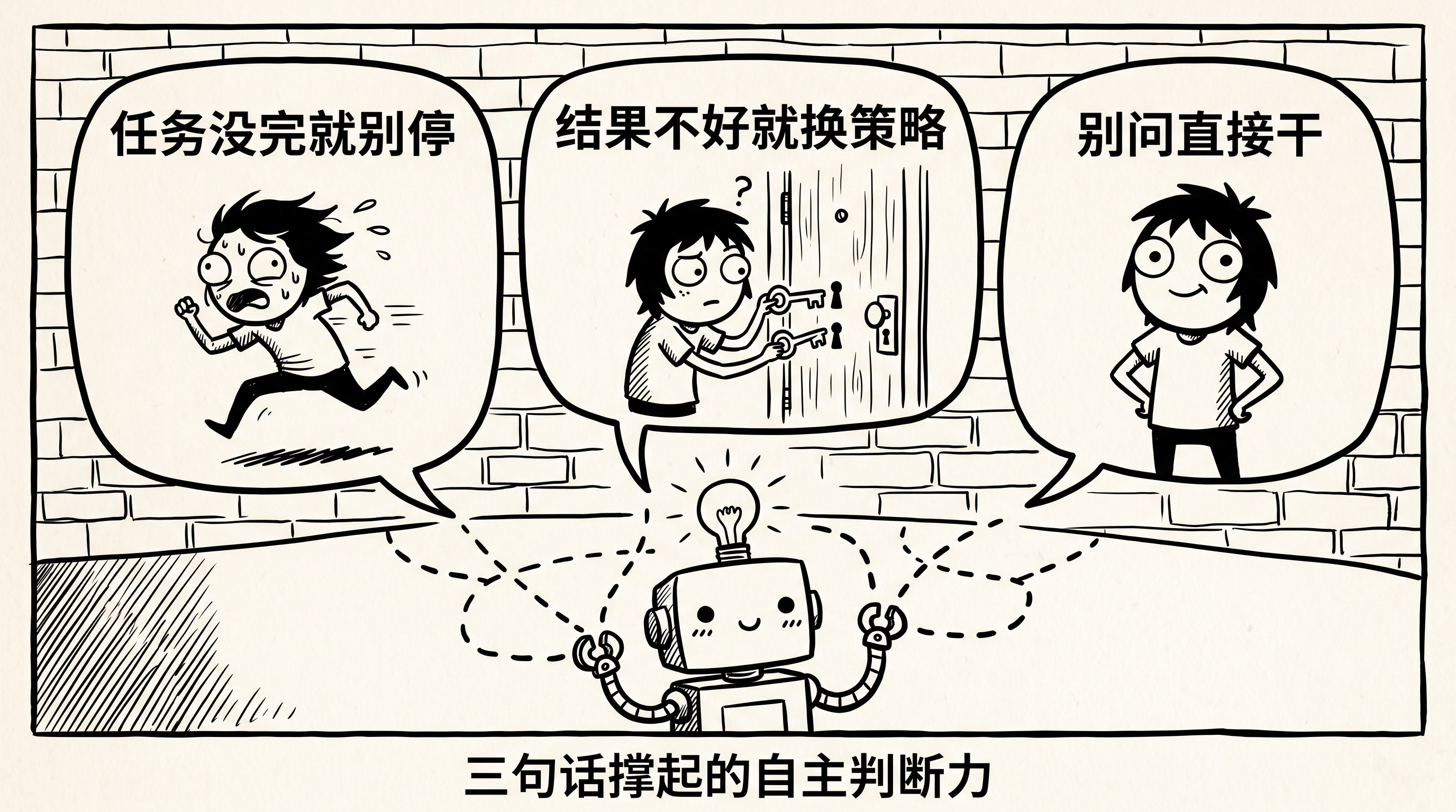 模型被告知的不是”按照A→B→C的步骤执行”,是”把事做完,遇到障碍想其它办法完成任务”。
