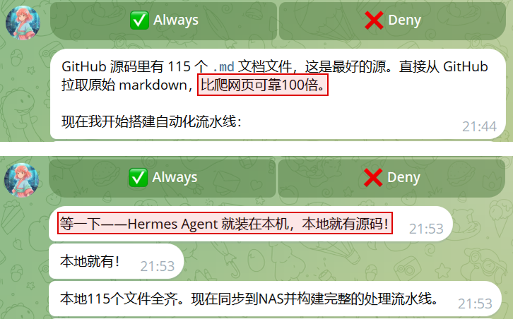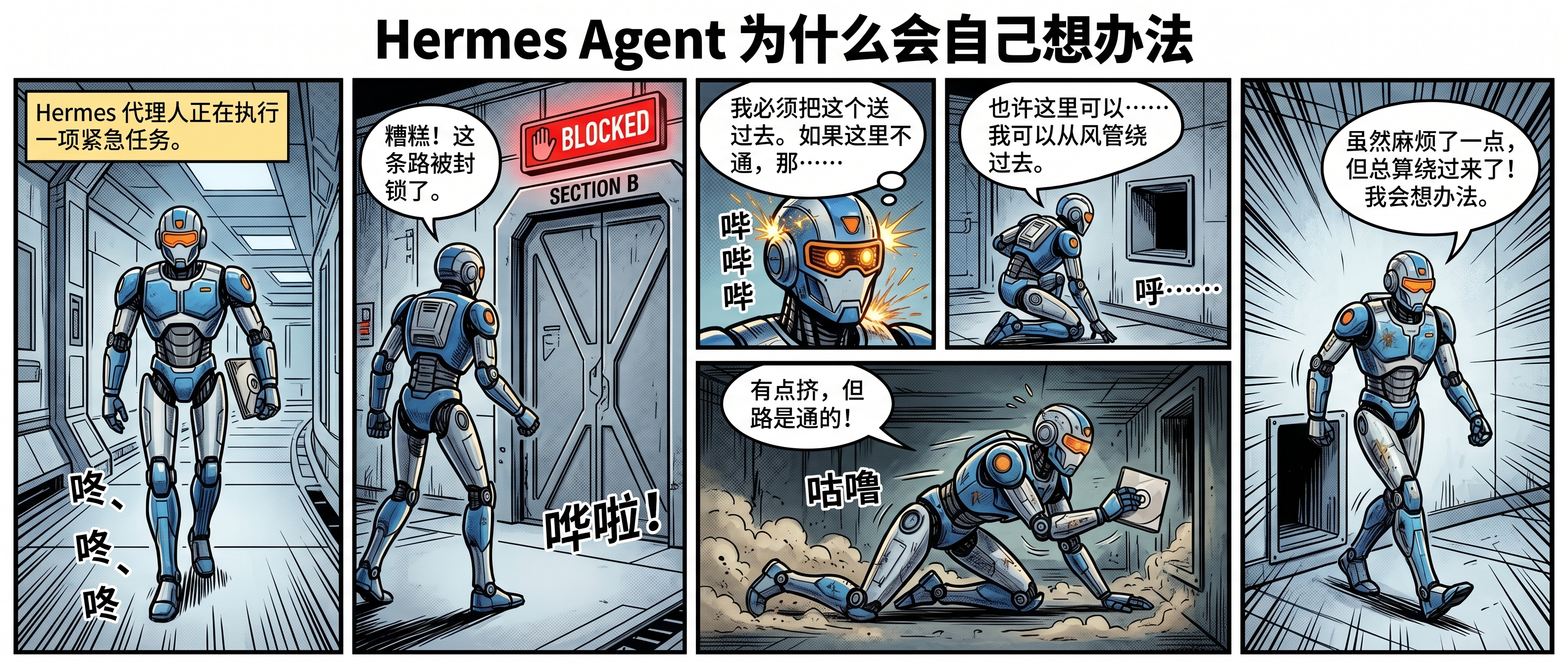 很多人用了 Hermes 之后会有一个感觉:它不只是能调用工具,它好像”知道”自己在干什么。面对障碍它会绕路,面对审批被拒它会换方法,甚至你不回复确认的时候它会自己想办法用别的方式把事办了。