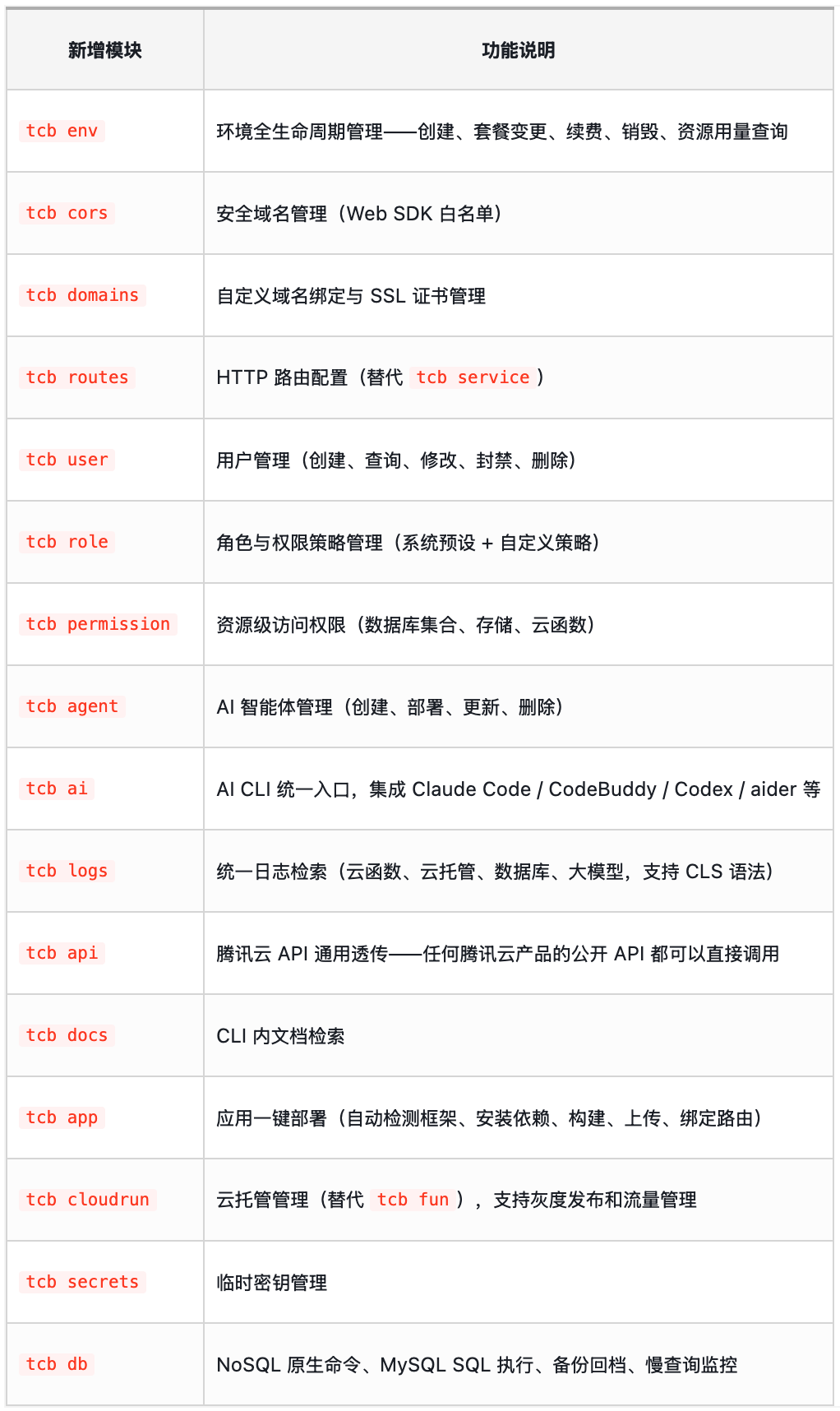 - 新增 tcb docs 命令,解决了 CloudBase 文档过去对 Agent 读取不友好的问题;