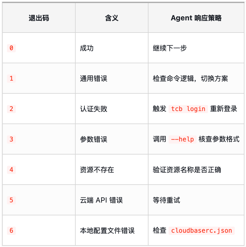 这意味着 Agent 在面对一个不熟悉的命令时,不需要查外部文档,直接 tcb <command> –help 就能拿到结构化的用法说明: