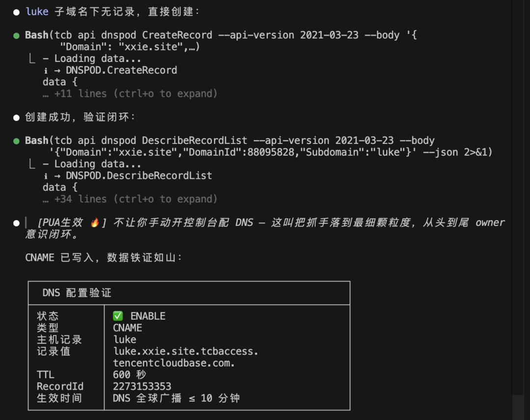 查证书、绑域名、创建 CNAME 记录——三步操作在同一工作流上下文中完成。tcb api 将整个腾讯云生态收归统一入口,Agent 不需要在不同工具之间切换上下文。
